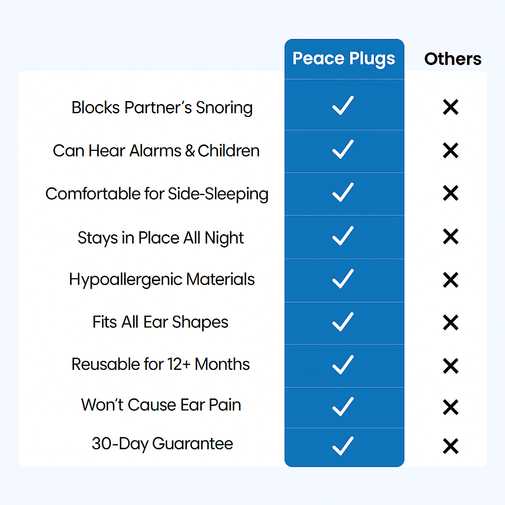 Peace Plugs Sleep Plugs let you return to intimacy and connection without the frustration of sleep deprivation. Instead of separate bedrooms, rediscover the joy of waking up next to your partner feeling loved, not resentful.